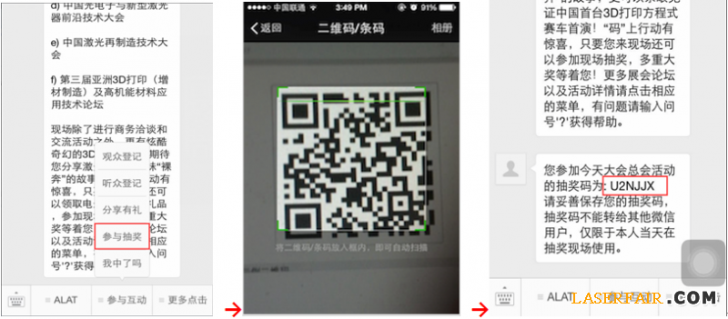 第2步:分享文章后,在 “激光制造網(wǎng)”公眾號功能菜單的“參與互動”內(nèi)選擇“參與抽獎”,將微信跳出的掃一掃窗口對準展會現(xiàn)場指定的二維碼圖片,掃描成功后你的微信即可收到一個抽獎碼信息,憑此抽獎碼信息即可參與大會現(xiàn)場抽獎活動。