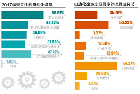 調(diào)研結(jié)果顯示,六成的買(mǎi)家2017年最受關(guān)注的自動(dòng)化設(shè)備是“工業(yè)機(jī)器人”,其次是“自動(dòng)化管理軟件”、“非標(biāo)及系統(tǒng)集成設(shè)備”、“機(jī)器視覺(jué)”和“運(yùn)動(dòng)控制及傳感技術(shù)”;在自動(dòng)化改造涉及最多的流程或環(huán)節(jié)中,超過(guò)六成的買(mǎi)家認(rèn)為是“組裝裝配”,其次是“測(cè)試測(cè)量”“異型插件”等。