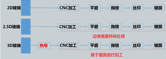 2D和2.5D玻璃防護(hù)屏產(chǎn)品的生產(chǎn)方法是將玻璃基板進(jìn)行切割,通過精雕、光孔、拋光、強(qiáng)化、絲印、鍍膜等加工后,制成各種規(guī)格型號(hào)的產(chǎn)品。3D曲面玻璃的生產(chǎn)流程與2D和2.5D產(chǎn)品基本相同,最大區(qū)別在于新增熱彎成型設(shè)備。