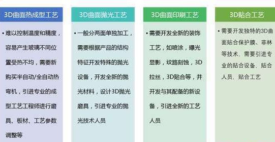 手機(jī)3D玻璃蓋板生產(chǎn)加工工藝的流程主要包括:工程→開料開孔→精雕→研磨→清洗→熱彎→拋光→檢測(cè)→鋼化→開模→UV轉(zhuǎn)印→鍍膜(PVD)→ 印刷(絲?。瘒娡浚?rarr;鐳雕→檢包→貼合→ 包裝等,工藝流程長(zhǎng),品質(zhì)要求高,而良率低。其難度主要體現(xiàn)在3D曲面成型、曲面拋光、曲面印刷、曲面貼合四大工藝上。