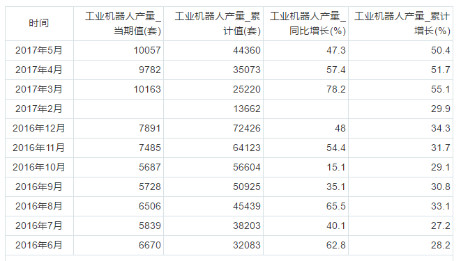 2016年6月至2017年5月我國工業(yè)機(jī)器人產(chǎn)量統(tǒng)計(jì)表