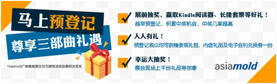 廣州國際模具展覽會觀眾預(yù)登記火熱進(jìn)行中,請掃碼登記或瀏覽網(wǎng)站:www.asiamold-china.com或電郵至asiamold@china.messefrankfurt.com。電話:020-38251558