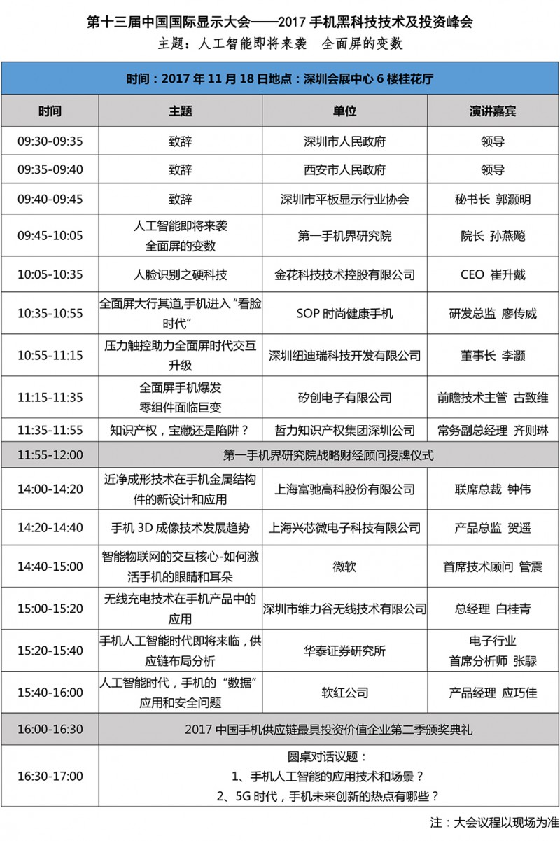 大會第一天日程為顯示峰會和“聯(lián)得裝備”——圓桌高峰論壇兩大部分,屆時工信部電子信息司、深圳市人民政府領導將解讀最新顯示產業(yè)政策、全球顯示產業(yè)學/協(xié)會負責人將到會致辭。同時力邀中、韓、日、臺灣及歐美等國家、地區(qū)的顯示產業(yè)鏈“產、學、研、政、經”各領域領軍人物共話產業(yè)發(fā)展趨勢和應用前景。大會第二天日程為“2017手機黑科技技術及投資峰會”,以“人工智能即將來襲、全面屏的變數”為主題,峰會分為主題演講、圓桌論壇兩大部分,屆時手機領域的知名專家學者和領軍企業(yè),將就人工智能及全面屏時代的到來,給手機產業(yè)帶來的挑戰(zhàn)和機遇進行深度探討,進而推動中國手機產業(yè)占據人工智能及全屏技術至高點。
