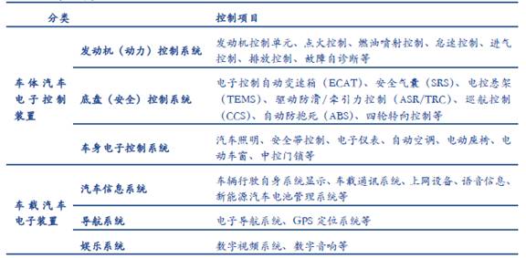 汽車電子可以分為兩大類:車體汽車電子控制裝臵和車載汽車電子裝臵。其中,車體汽車電子控制裝臵主要包括動力控制系統(tǒng)、安全控制系統(tǒng)和車身電子系統(tǒng),車用PCB 中動力控制系統(tǒng)的需求量較大,對于新能源汽車而言表現(xiàn)更明顯;其次是車身電子系統(tǒng),包括汽車照明、安全氣囊(SRS)、TMPS、電子儀表、自動空調(diào)、電動座椅、電動車窗、中控門鎖等,其中LED 照明對PCB 產(chǎn)品(金屬基板)需求較高;第三是安全控制系統(tǒng),主要包括ADAS 等。