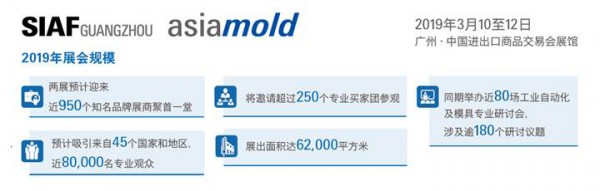 SIAF廣州工業(yè)自動(dòng)化展歷經(jīng)九年磨練,一直處于華南智能制造行業(yè)前沿,促進(jìn)產(chǎn)業(yè)技術(shù)互融與革新,至今已發(fā)展為不可缺席的行業(yè)年度盛會(huì)。2019SIAF展會(huì)將再度與廣州國際模具展覽會(huì)(Asiamold)同期舉行,于31012日于廣州中國進(jìn)出口商品交易會(huì)展館迎來世界各地的業(yè)內(nèi)人士,展示應(yīng)用領(lǐng)域涵蓋汽車工程、家電制造、電子工程、機(jī)械工程、包裝印刷、消費(fèi)品、照明、紡織品、醫(yī)療器械等,繪畫智能制造的未來藍(lán)圖。