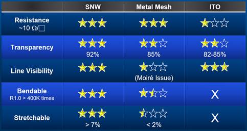 江博士表示,之所以選擇納米銀線,也是多方考慮后選擇的結(jié)果。因?yàn)榧{米銀線相對(duì)于其他柔性觸控材料、如金屬網(wǎng)格、石墨烯等材料,其性能的優(yōu)越性更為全面。