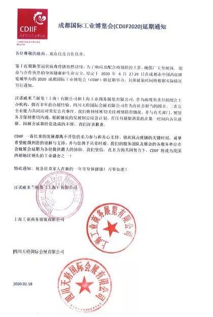關(guān)于2020成都國際工業(yè)博覽會(huì)(CDIIF2020)延期舉辦的通知