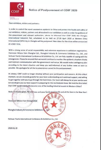 In order to control the novel coronavirus epidemic in China and protect the health and safety of our exhibitors, visitors, partners and all involved in our exhibition as well as under the guidance of the government and relevant authorities, please be informed that CDIIF 2020, the Chengdu International Industrial Fair, scheduled to be held on 27-29 April 2020 at Western China International EXPO City in Chengdu will be postponed. New dates for the show will be announced at a later time.