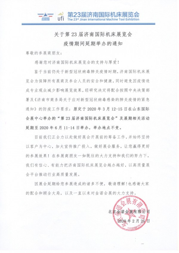 關于第二十三屆濟南國際機床展疫情期間延期舉辦的通知