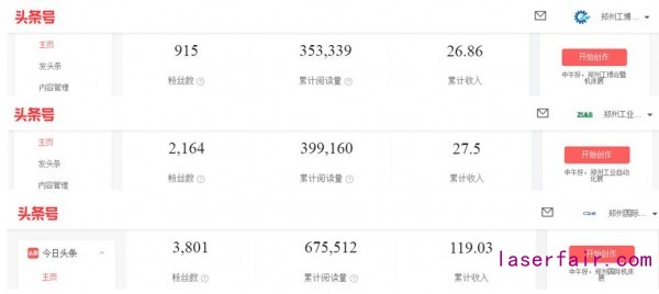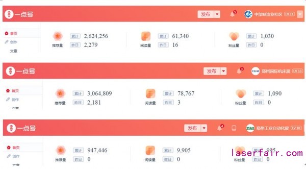目前鄭州工博會(huì)3個(gè)頭條官方賬號(hào)總粉絲6834人,累計(jì)總閱讀近150萬(wàn),以中西部制造業(yè)內(nèi)容為基礎(chǔ),輻射全國(guó)裝備制造業(yè),我們現(xiàn)在就是行業(yè)內(nèi)做的最好的,今后也會(huì)做得更好!努力打造國(guó)內(nèi)裝備制造業(yè)行業(yè)平臺(tái)!