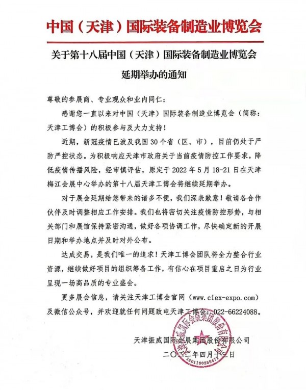 感謝您一直以來對中國(天津)國際裝備制造業(yè)博覽會(簡稱:天津工博會)的積極參與及大力支持! 近期,新冠疫情已波及我國30個省(區(qū)、市),目前仍處于嚴防嚴控狀態(tài)。為積極響應(yīng)天津市政府關(guān)于當前疫情防控工作要求,降低疫情傳播風險,經(jīng)審慎評估,原定于2022年5月18-21日在天津梅江會展中心舉辦的第十八屆天津工博會繼續(xù)延期舉辦。具體時間另行通知。